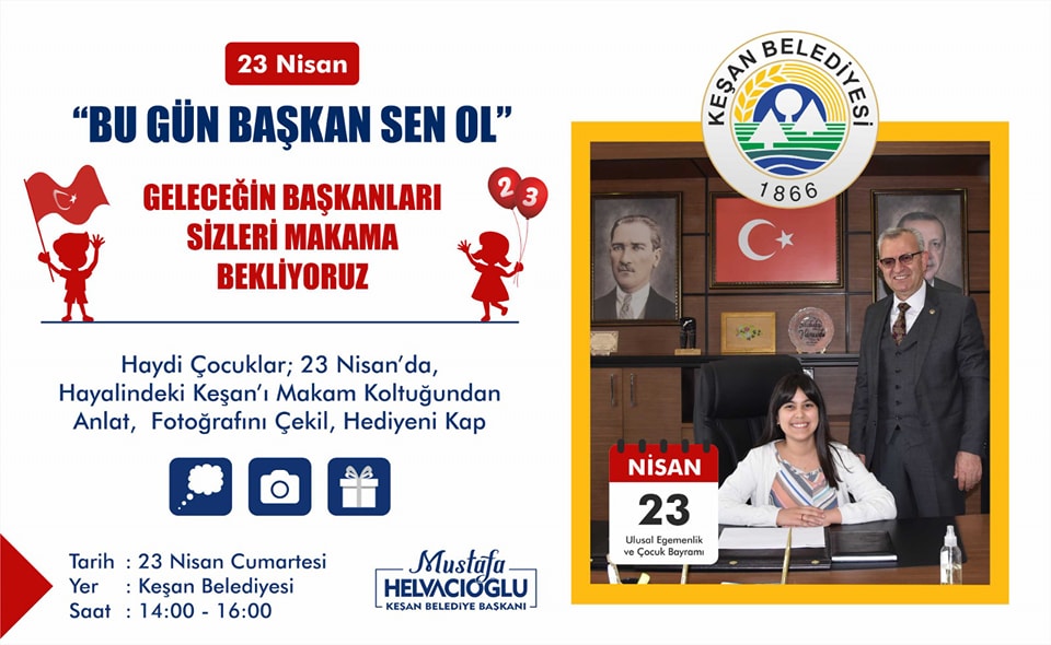 Etkinlikle ilgili bilgi veren Keşan Belediye Başkanı Mustafa Helvacıoğlu, “Gazi Mustafa Kemal Atatürk 23 Nisan’ı ülkemizin geleceği olan çocuklara armağan etti. 23 Nisan’ın çocuklarımıza armağan edilmesi bu milletin geleceğine verdiği önemi gözler önüne sermekte. Yarınlarımızın teminatı olan çocuklarımız ülkemizi daha da güzel yarınlara taşıyacak. Biz de Keşan Belediyesi olarak çocuklarımızın hayalindeki Keşan’ı bir idareci gibi makam koltuğundan anlatmalarını ve geleceğe güzel anılar bırakmalarını istedik. Sürpriz hediyelerimizin yer aldığı etkinliğimize tüm çocuklarımızı bekliyoruz.” dedi.