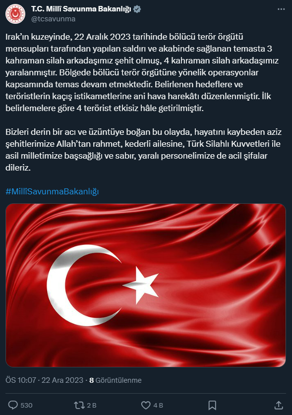 ‘Irak’ın kuzeyinde, 22 Aralık 2023 tarihinde bölücü terör örgütü mensupları tarafından yapılan saldırı ve akabinde sağlanan temasta 3 kahraman silah arkadaşımız şehit olmuş, 4 kahraman silah arkadaşımız yaralanmıştır. Bölgede bölücü terör örgütüne yönelik operasyonlar kapsamında temas devam etmektedir. Belirlenen hedeflere ve teröristlerin kaçış istikametlerine ani hava harekatları düzenlenmiştir. İlk belirlemelere göre 4 terörist etkisiz hale getirilmiştir.