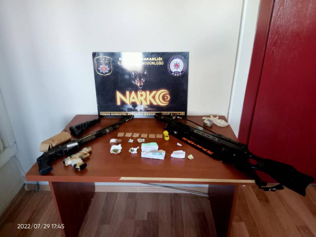 Aramalarda; 1 adet havalı tüfek, 1 adet pompalı tüfek, 1 adet kurusıkı tabanca, 6 fişek eroin maddesi, 1 fişek toz esrar, 4 fişek bonzai maddesi, 1 adet Ecstasy hap, 1 fişek kubar esrar maddesi, 9,98 gram Kenevir tohumu ele geçirildi.