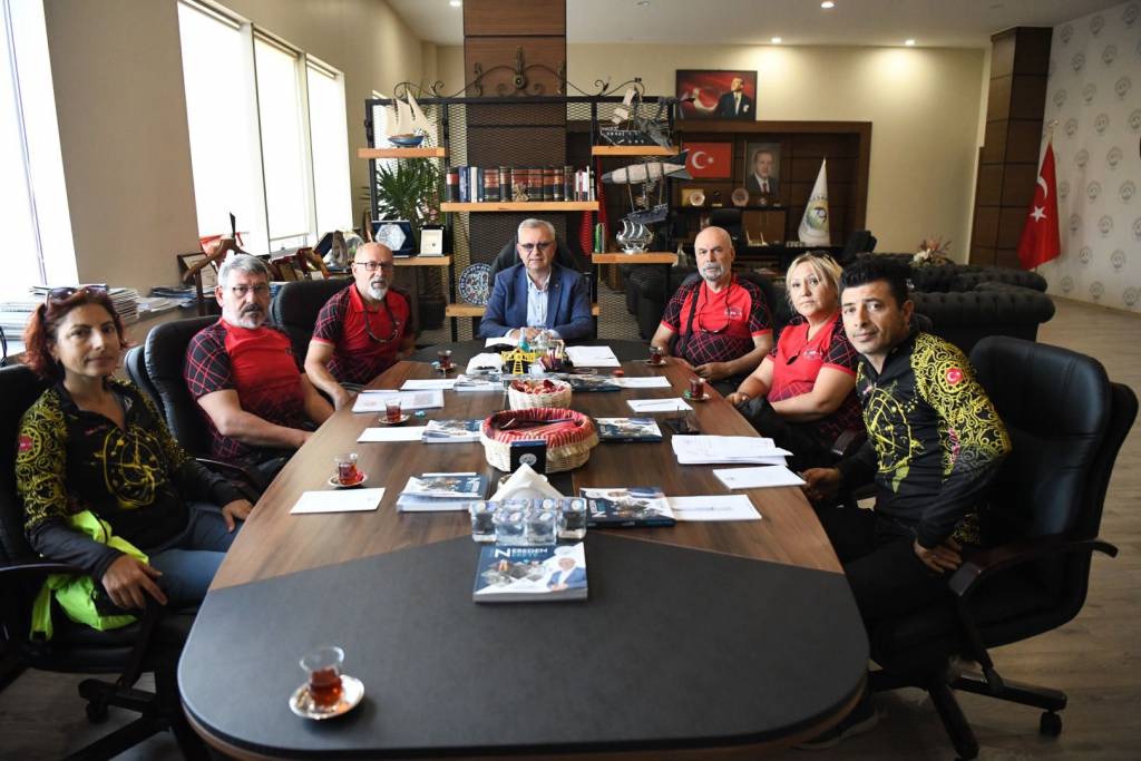 Ziyarette konuşan Eker, “SARDOS olarak kurulduğumuz günden bugüne kadar milletimizin temel taşları olan tarihi, milli ve özdeğerlerimizi her zaman önemsedik. Bu değerlerin yıldönümlerinde gerek anma gerekse kutlama programlarının hep içinde olmaya çalıştık. 2015 yılında Çanakkale Zaferi’nin 100. yılı dolayısıyla, ‘100. Yılda Atamızın Yolunda, Abideden Anıtkabir’e projesi ile Abideden aldığımız şehit kanları ile sulanmış toprağımızı Anıtkabir’e götürdük. 2019’da Atatürk’ün Samsun’a çıkışının 100. yılında ‘Ata’nın Doğduğu Yerden, Vatanın Doğduğu Yere 1453 km’ projesiyle Selanik Başkonsolosumuzdan aldığımız bayrak ve Ata’mızın evinden aldığımız toprağı bisikletlerimizle Samsun’a götürdük. Bu yıl da SARDOS olarak yine Keşan Belediyemiz iş birliğinde, Büyük Taarruz Zaferi’nin 100. yılı anısına ‘Keşan 100. Yılda Zafer Yolunda’ projemiz kapsamında bir tur gerçekleştireceğiz. Amacımız Mustafa Kemal Atatürk tarafından 19 Mayıs 1919 tarihinde yakılan istiklal ateşinin nihai sonucu olan Büyük Taarruz Zaferinin 100 yılı dolayısıyla farkındalık yaratıp, bu günlere nereden ve nasıl zorluklarla geldiğimizin sorgulanması, tarihi ve milli değerlerimize sıkı sıkıya sahip çıkılması gereğinin mesajını vermek. Bu sebeple Büyük Taarruz zaferinin mutfağı Akşehir Batı Cephesi Karargahından alacağımız bayrağımızı bisikletlerimiz ile cephedeki birliklerimizin izini takip ederek, anıt ve şehitlikleri ziyaret ederek 9 kişi ile 9 gün pedal çevirip 9 Eylül’de İzmir valimize teslim etmek. 100 yıl önce olduğu gibi bugün de taşıyacağınız ay yıldızlı al bayrağımızın Alsancak’ta göndere çekilmesini sağlamaktır. Bu uğurda canını veren, kanını döken tüm şehit ve gazilerimizi şükran ve minnetle yad ediyoruz. Yaşasın tam bağımsız Türkiye Cumhuriyeti.” dedi.