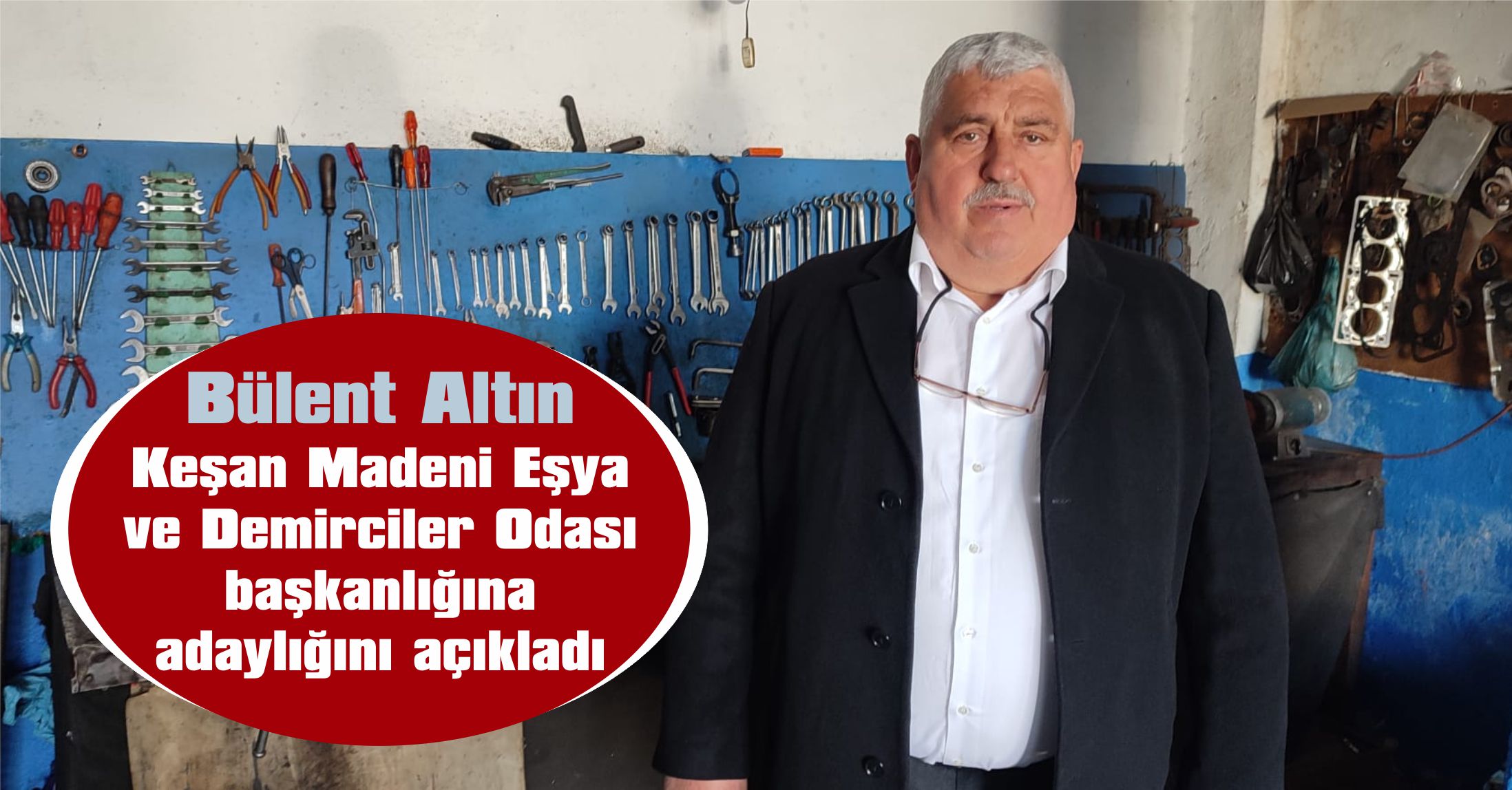 Bugün, sanayi sitesindeki işyerinde adaylığını açıklayan Bülent Altın, Keşan Madeni Eşya ve Demirciler Esnaf Odası genel kurulunun, 8 Mart 2026 tarihinde gerçekleştirileceğini bildirdi.