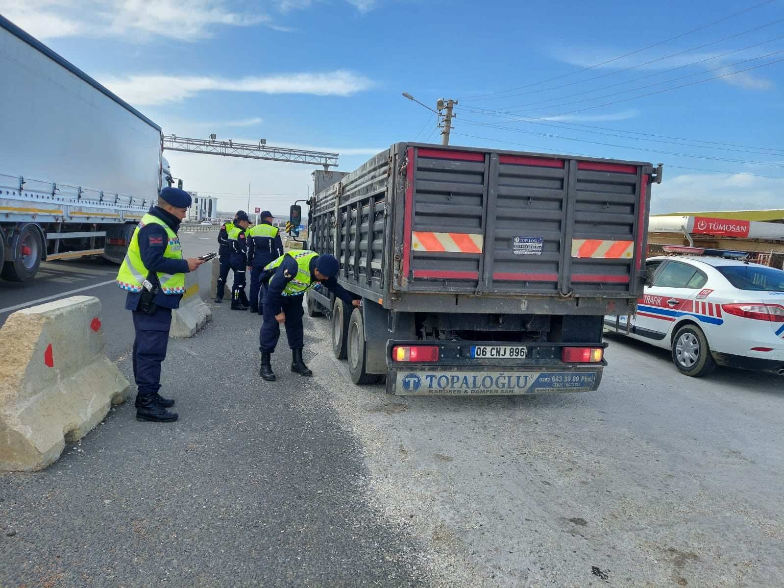 Keşan – İstanbul kara yolundaki kontrol noktasında bulunan jandarma trafik timi, ticari araçlarda kış lastiği denetimi yaptı.