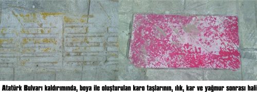 Atalarımız: “Darı unundan baklava, incir ağacından oklava olmaz” demişler. Ben de o yazımda, boya ile karo taşı yaratılamayacağını belirtmiştim. Betonu; sulu boya ile mi, pastel boya ile mi boyamışlar ki; biraz kar, biraz da yağmur yağınca, renkli karo taşlarının çoğu; yazı başlığının altındaki fotoğraflarda görüldüğü gibi olmuş. Destanın hüsran sayfalarını yaz, yaz bitmiyor.
