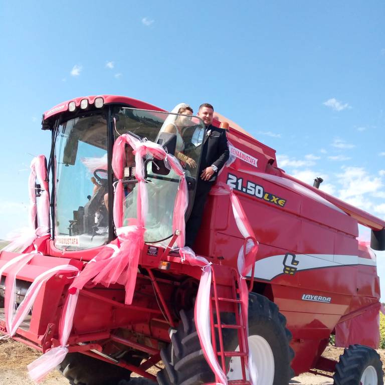 Köyde çiftçi olan Mustafa Fıçı, evlenme düğününde gelin arabası olarak kendisine ait biçerdöveri yaptı.