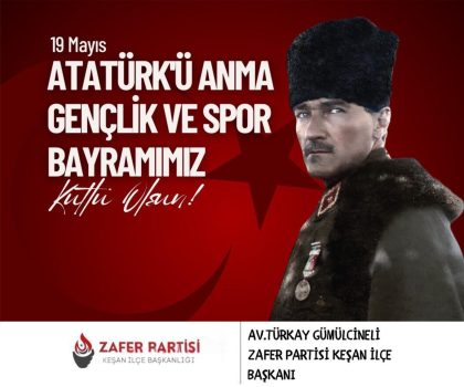 Zafer Partisi Keşan İlçe Başkanı Av. Türkay Gümülcineli, yarın kutlanacak 19 Mayıs Atatürk’ü Anma, Gençlik ve Spor Bayramı nedeniyle mesaj yayımladı.
