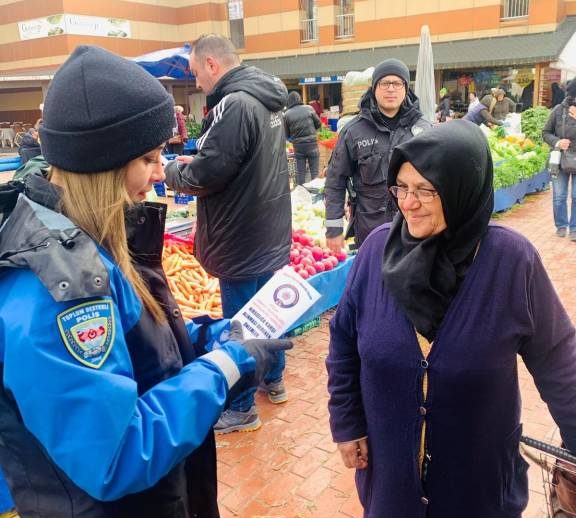 Cumartesi günü kurulan halk pazarında esnafa ve vatandaşlara hırsızlık, yankesicilik, sahte para ve dolandırıcılık konularında bilgilendirme broşürleri dağıtan toplum desteli polisler, sözlü olarak da bu konularla ilgili uyarılarda bulundu.