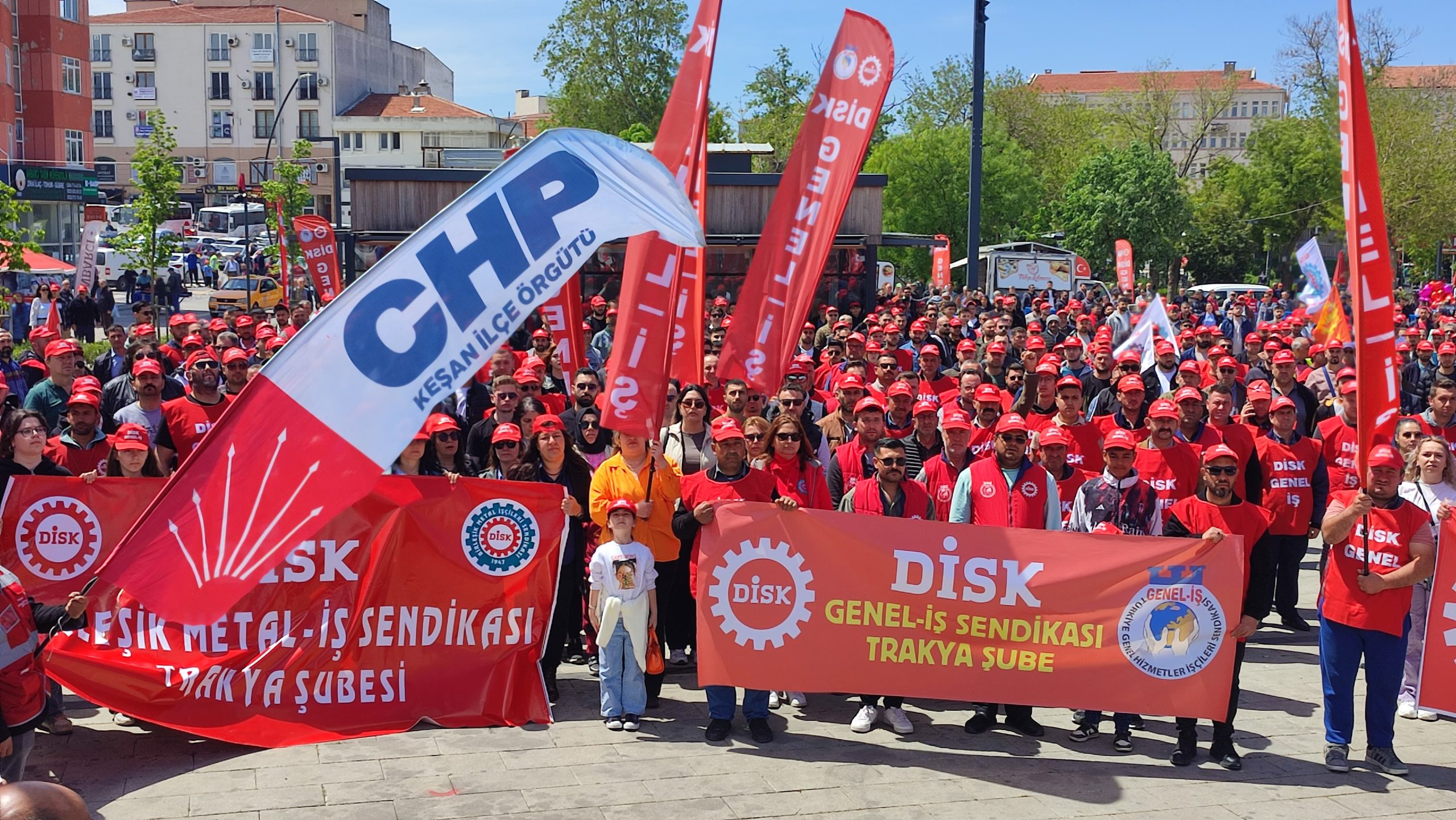 Açıklama şöyle: “Bugün dünyanın dört bir yanındaki kardeşlerimizle beraber demokrasiye, adalete, özgürlüğe, eşitliğe, kardeşliğe ve barışa dair umutlarımızı ve taleplerimizi haykırıyoruz. Bugün Cumhuriyet Meydanı’nda Trakya’nın dört bir tarafından gelen emekçiler olarak Taksim’de, 1977 1 Mayıs’ında katledilenleri anıyoruz. Taksim, 1 Mayıs alanıdır. Taksim, unutulmayanların adıdır. Taksim, hesap sorunların sesidir. Taksim biziz. Bizler, işçiler, emeciler, emekliler. Bu ülkenin büyük çoğunluğuyuz. Bizler üretiyoruz, bizler çalışıyoruz. Bizler bu ülkenin tüm değer ve güzelliklerini emeğimizle var ediyoruz ve insanca yaşamayı hak ediyoruz. Ancak bugünlerde değil insanca yaşamak hayatta kalmak dahi giderek zorlaşıyor. İnsanca yaşayamıyorsak bu ülke fakir olduğu için değil Ülkenin kaynakları yetersiz olduğu için değil Ülkeyi yönetenlerin yoksuldan alıp zengine işçiden emekçiden kısıp sermayeye kaynak aktarmayı görev bildiği içindir. Bankalar holdingler, şirketler karlılık rekorları kırarken ekonomik krizin faturasını bizlere kesiyorlar. Çalışanların omuzlarına yüklenen vergiler ve kesintiler artık yeter denecek kadar çok kazançlarımızın yarıdan fazlası vergi dolaylı vergi sgk ve diğer kesintilere gidiyor. Az kazanandan çok, Çok kazanandan az vergi alınıyor. Hatta patronların vergi borçları bir gecede siliniyor. Dostlar, emekçiler, tüm dünyada işçilerin yaşadığı en büyük sorunlardan birisi, iş cinayetleri ve güvencesiz çalışma koşulları. Türkiye’de 2024 yılında, 1897 işçi, iş kazaları nedeniyle hayatını kaybetti. ILO(Uluslararası çalışma örgütü) verilerine göre işçi cinayetlerinde dünyada üçüncü ülke durumundayız. İşçi cinayetleri, fıtrat meselesi değildir; işçi sağlığı ve iş güvenliği önlemlerinin