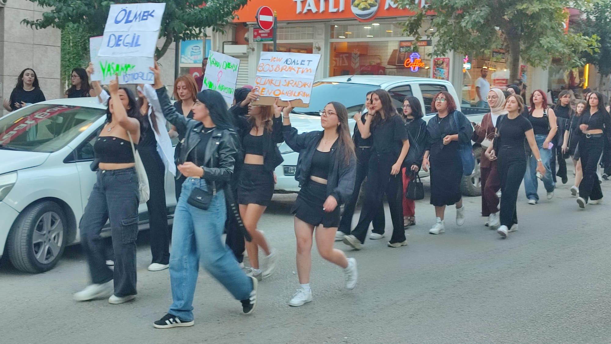 ‘Ölmek değil, yaşamak istiyoruz.’, ‘Dikkat! Bu ülkede kadın katliamı var.’, ‘Sokakta korkarak de özgürce dolaşmak istiyoruz.’ şeklinde sloganlar atarak yürüyen kızlar, Cumhuriyet Meydanı’ndaki köy garajının olduğu noktada polis tarafından durduruldu.