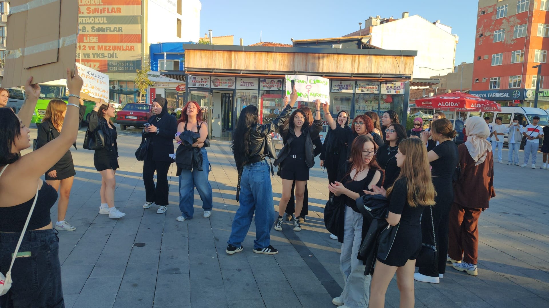 Keşan’daki yüksekokullarda öğrenim gören kız öğrenciler, Türkiye genelinde yaşanan ve son olarak bir kadının başının kesilerek öldürülmesiyle olayını protesto etmek amacıyla, bugün eylem yaptı.