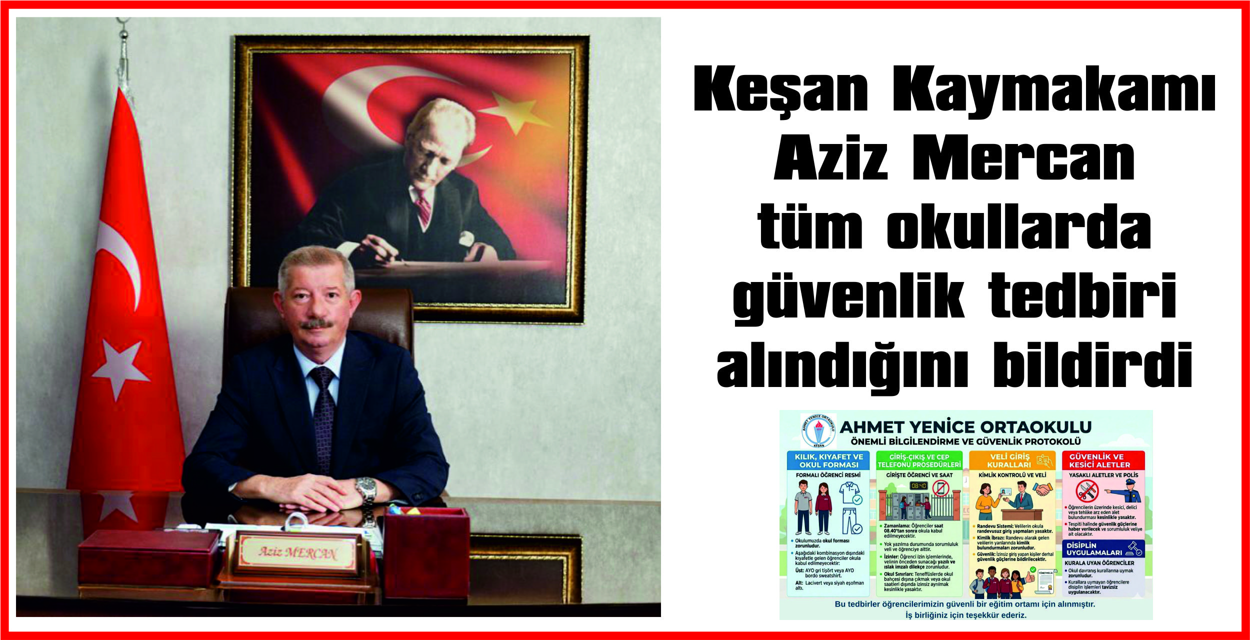 Keşan Kaymakamı Aziz Mercan, Keşan’daki tüm okullarda güvenlik önlemlerinin titizlikle alındığını bildirerek, kamuoyunun da bilgilenmesi amacıyla alınan tedbirleri açıkladı.