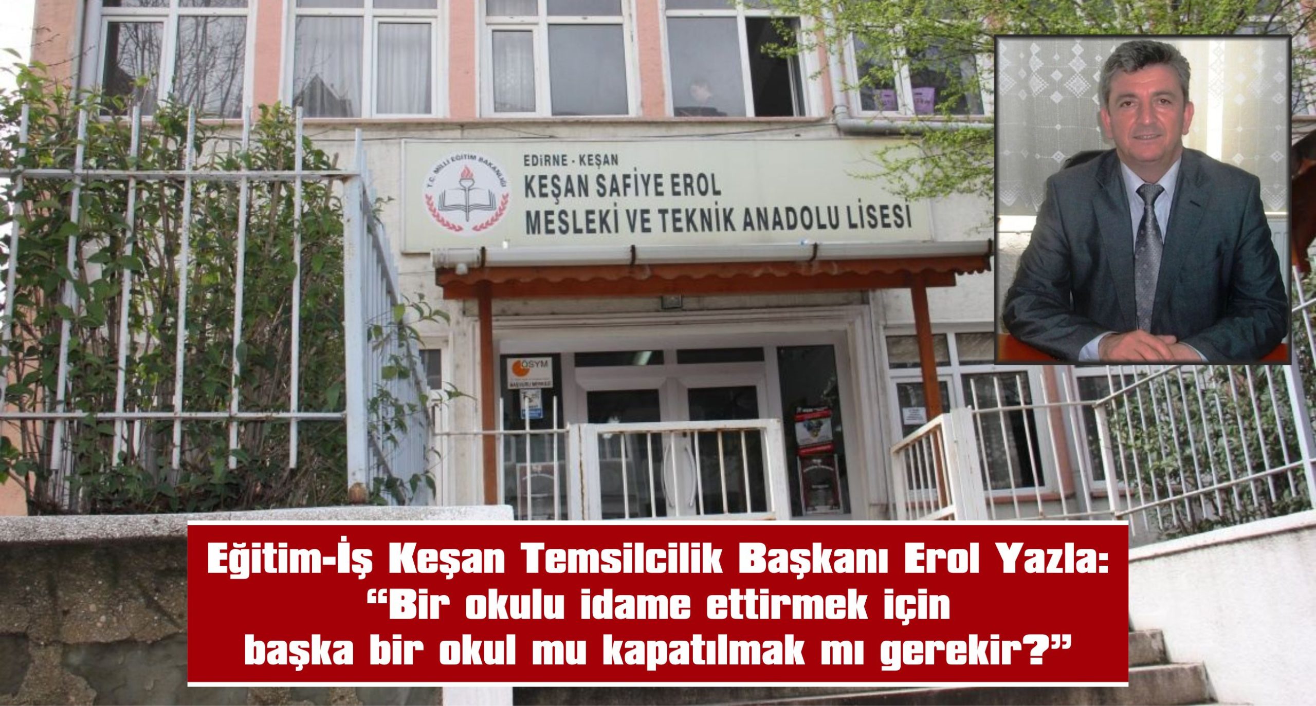 Eğitim-İş Keşan Temsilcilik Başkanı Erol Yazla, yaptığı yazılı açıklamada, Keşan Safiye Erol Mesleki ve Teknik Anadolu Lisesi’nden bölümlerin taşınarak okulun kapatılmak istendiğini vurguladı.