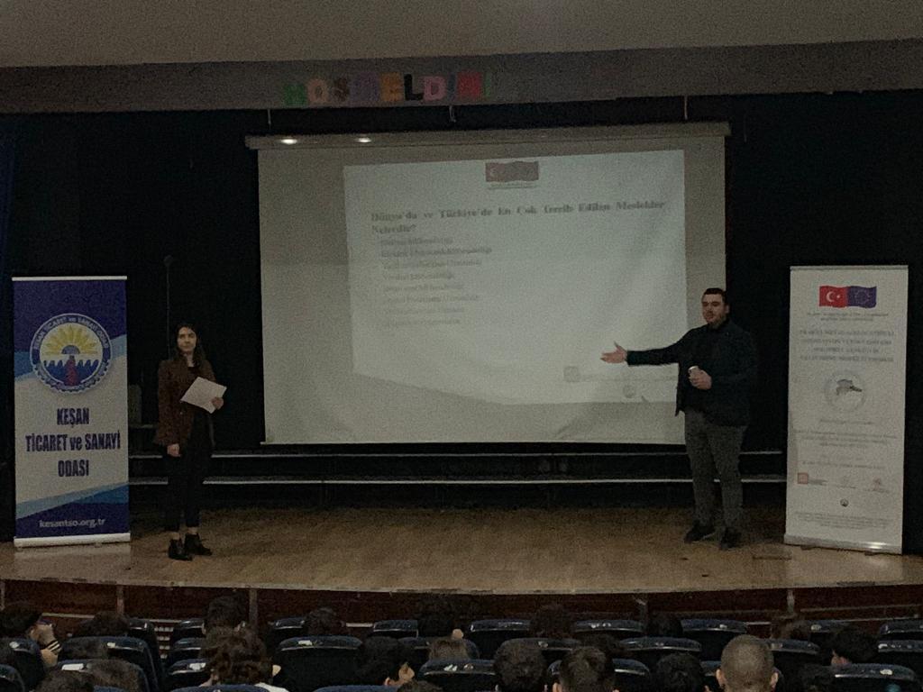 Daha sonra Keşan TSO Avrupa Birliği Proje Sorumlusu Göksu Yıldız tarafından Mesleki Rehberlik ve Kariyer Danışmalığı sunumu yapıldı. Sunum kapsamında Yıldız, meslek seçimi yaparken mesleki rehberlik ve kariyer danışmanlığının öneminden, avantajlarından bahsederken, dünyada ve Türkiye’de en çok tercih edilen meslekler ve geleceğin meslekleri ile ilgili yapılan araştırmalar ve raporlar üzerinden öğrencilere bilgi aktardı.