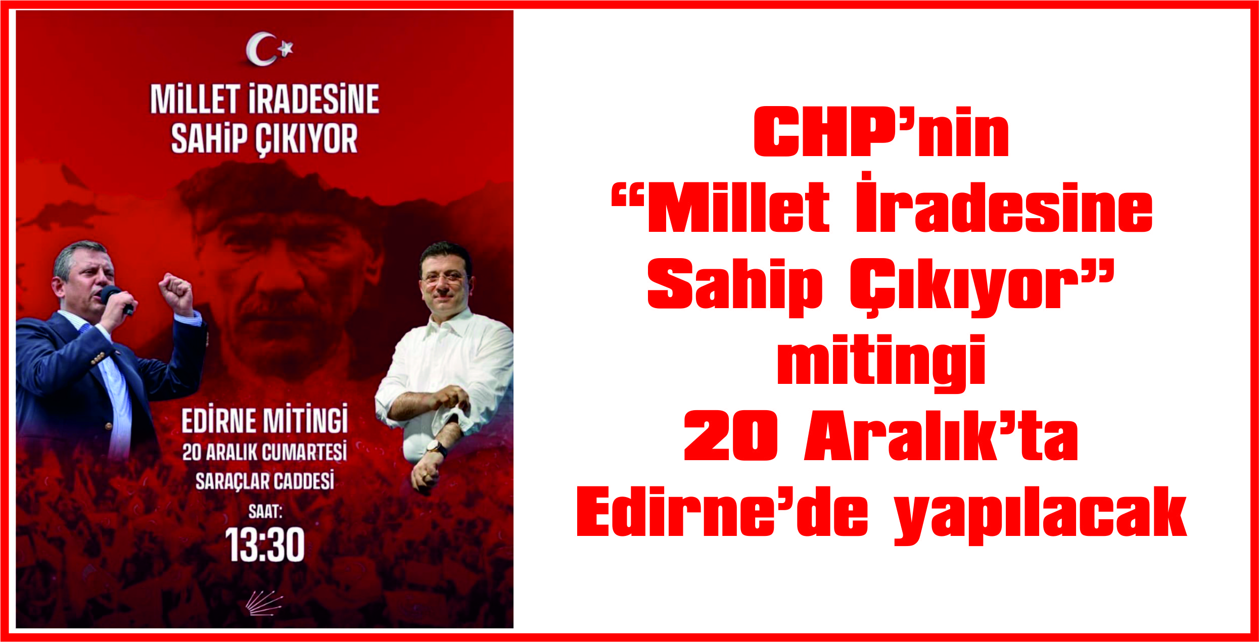 CHP’nin Millet İradesine Saygı Mitingi, Genel Başkan Özgür Özel’in katılımıyla, Edirne’de saat 13.30’da Saraçlar Caddesi’nde yapılacak.