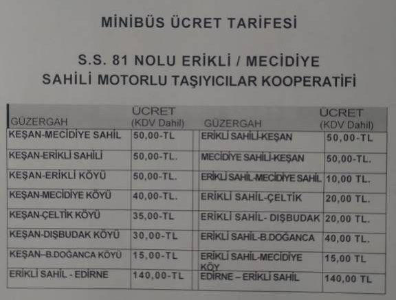 Yetkililer, Keşan’dan Mecidiye, Erikli ve Yayla sahillerine gidecek olan yolculardan bir süreliğine eski fiyat olan 40 TL alınacağı bildirildi.