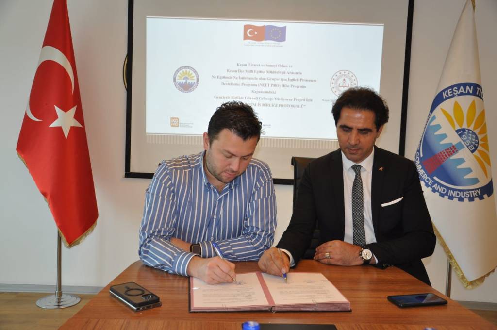 ‘Ne Eğitimde Ne İstihdamda Olan Gençler İçin İş Gücü Piyasasını Destekleme Hibe Programı (NEET PRO)’ kapsamındaki ‘Gençlerle Birlikte Güvenli Geleceğe Yürüyoruz Projesi’ için Keşan TSO (Ticaret ve Sanayi Odası) ile Keşan İlçe Milli Eğitim Müdürlüğü arasında iş birliği protokolü imzalandı.