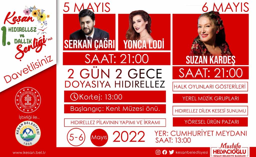 5-6 Mayıs 2022 tarihlerinde gerçekleştirilecek Keşan 1. Hıdırellez ve Dallık Şenliği’nde 2 gün 2 gece doyasıya eğlenceli saatler yaşanacak.