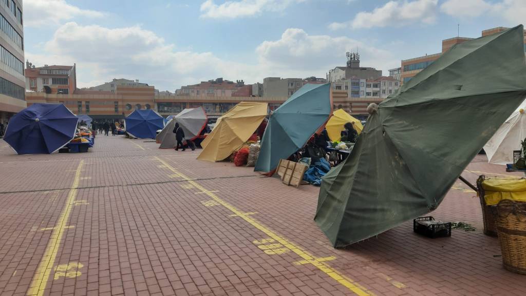 Şemsiyelerini yan yatırarak rüzgârdan, tenekede karton yakarak soğuktan korunmaya çalışan pazarcı esnafı, tüm olumsuzluklara rağmen yağmur ve kar yağmadığı için şükretti.