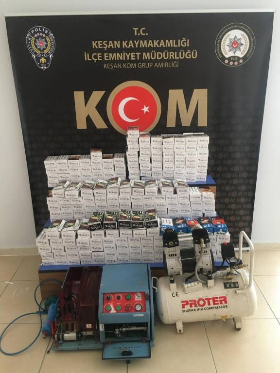 Keşan İlçe Emniyet Müdürlüğüne bağlı Kaçakçılık ve Organize Suçlarla Mücadele (KOM) Grup Amirliği ekipleri, bugün bir eve yaptıkları operasyonda sigara sarma makinesi, kompresör ile binlerce boş ve doldurulmuş makaron ele geçirdi.