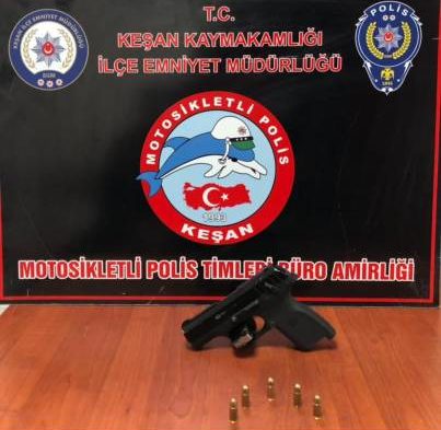 5 Nisan 2023 Çarşamba günü saat 13.00 sıralarında Yenimescit Mahallesi Ensar Sokak üzerinde devriye görevi yapan Keşan İlçe Emniyet Müdürlüğü ekipleri, şüphelendikleri bir kişin üzerinde silah buldu.