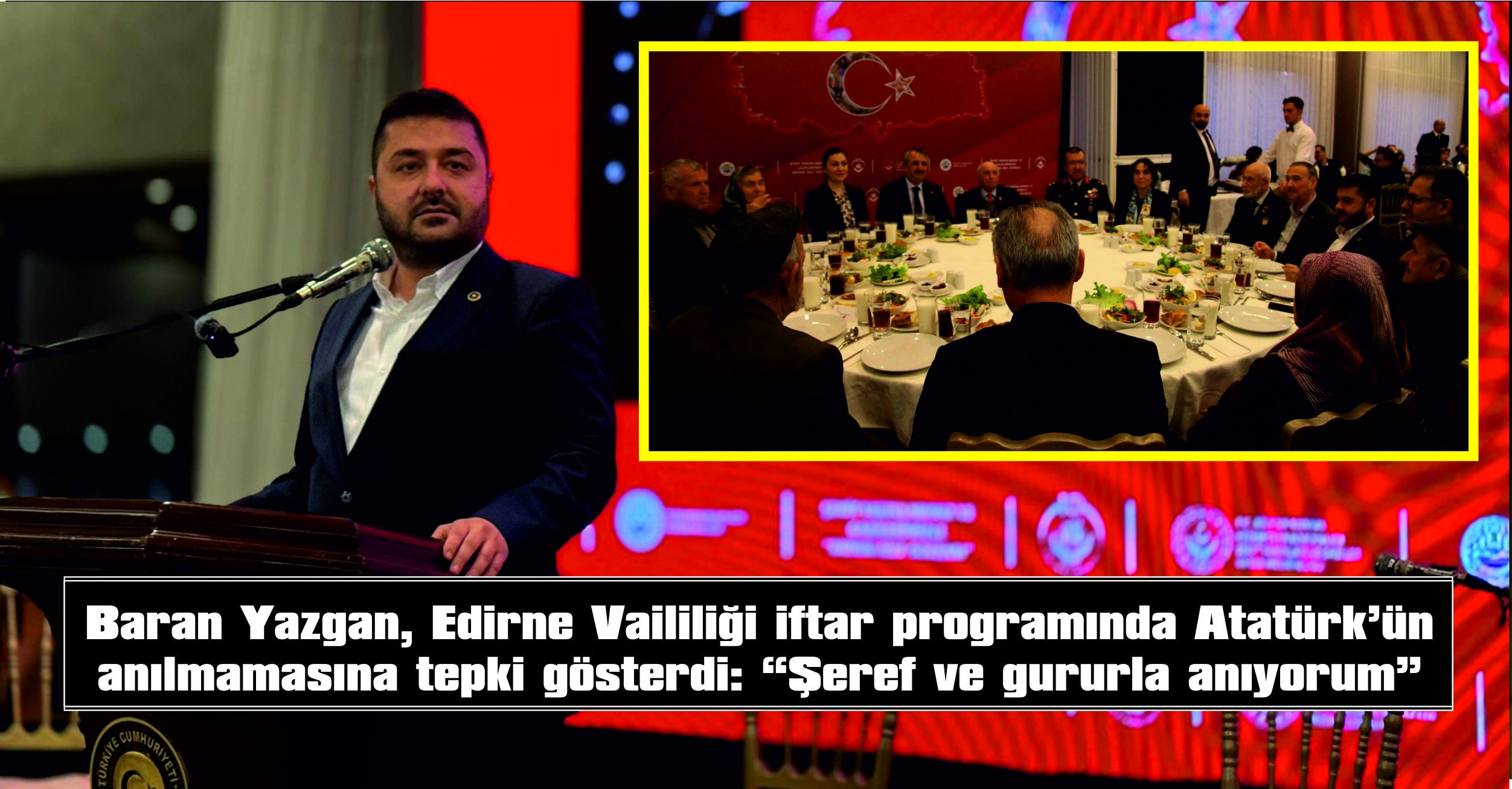 CHP Edirne Milletvekili Ahmet Baran Yazgan, Edirne Valiliği tarafından düzenlenen iftar programında Cumhuriyetimizin Kurucusu Mustafa Kemal Atatürk’ün anılmamasına kürsüden “Atatürk ve silah arkadaşlarını şeref ve gururla anıyorum” tepkisini gösterdi.