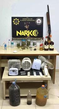 Aramada 1 kilogram 972 gram esrar, 18 adet sentetik ecza hap, 6 adet ecstasy hap, 1.12 gram kenevir tohumu, 1 hassas terazi, 1 av tüfeği ve çeşitli kaçak içkiler bulundu.